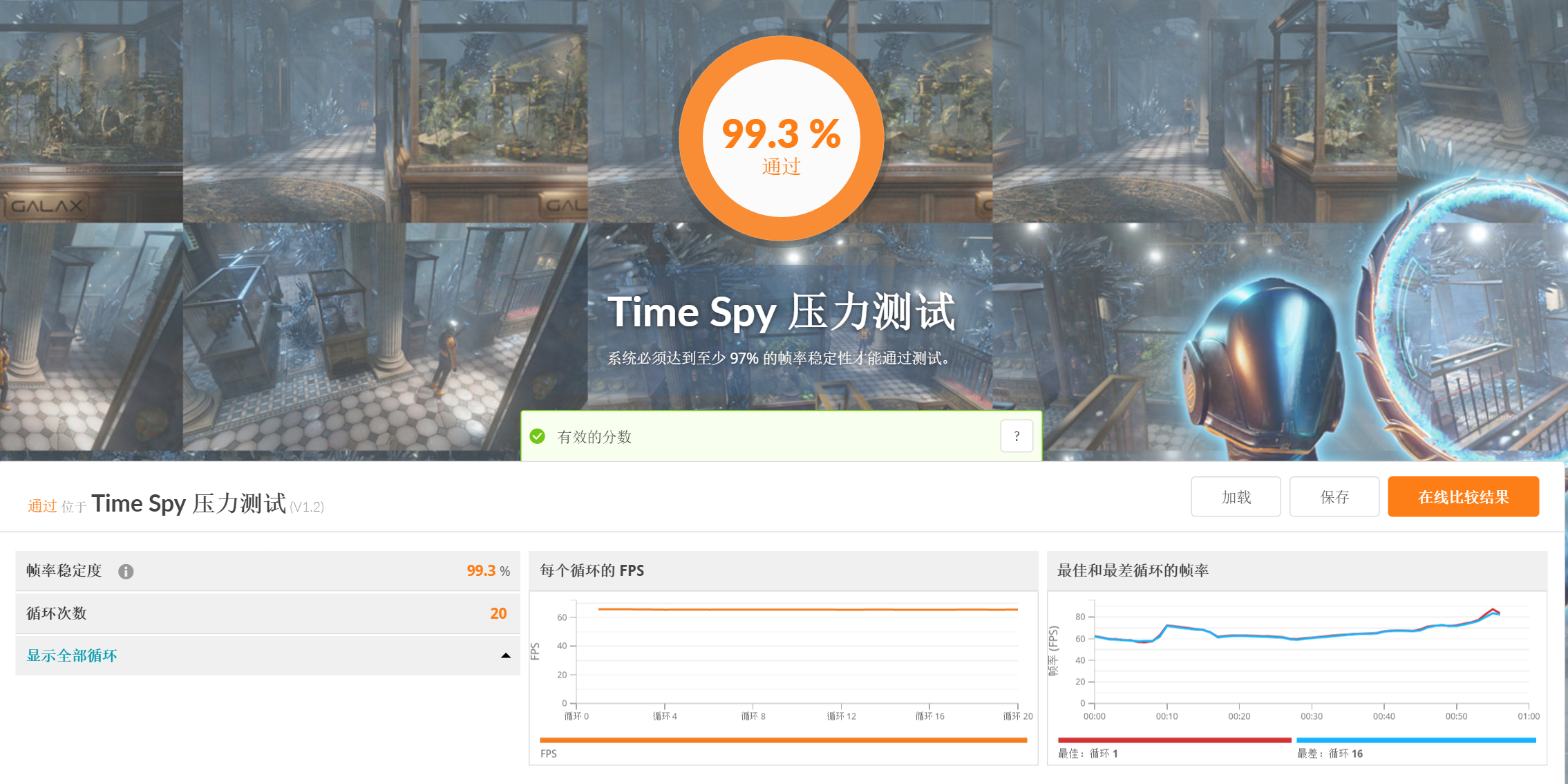 在Time Spy压力测试中99.3%分数通过,表现不错。