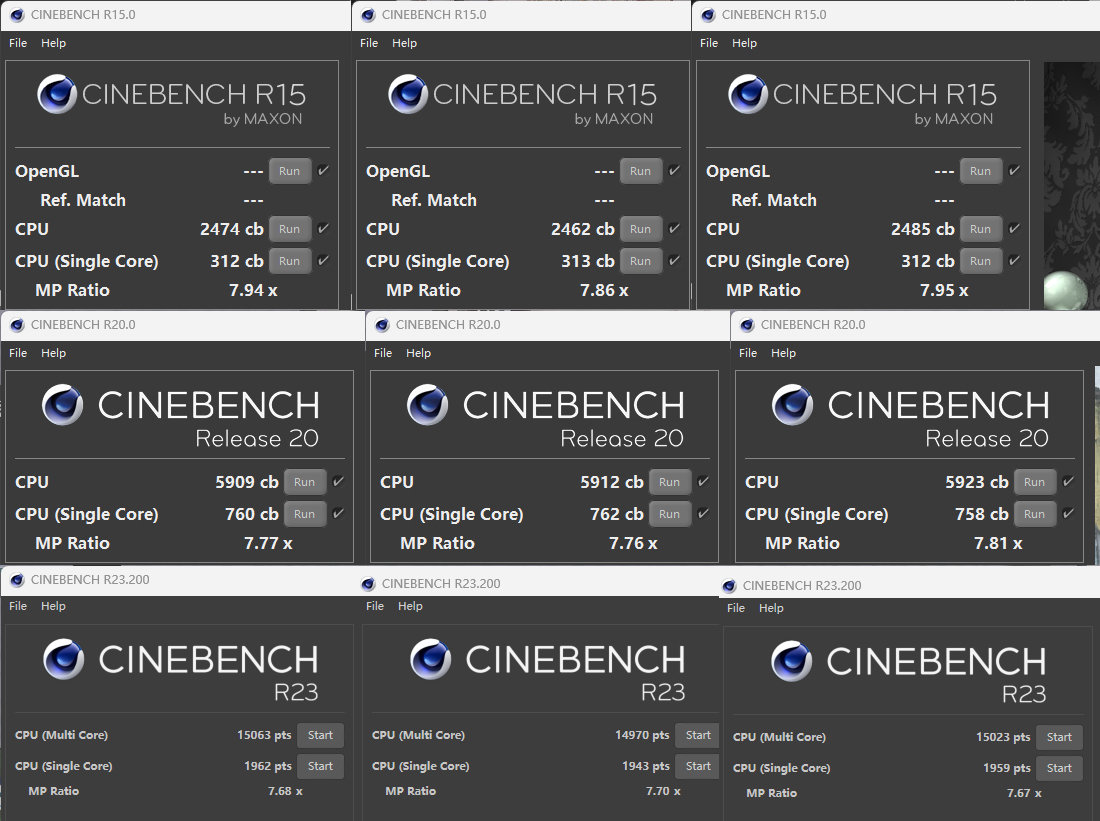 7600XR15单核跑分312,多核2473;R20单核760,多核5914;R23单核1954,多核15018。