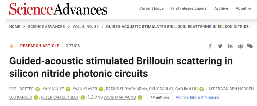 而此次成果解决了上述问题。近日,相关论文以《氮化硅光子电路中的引导声受激布里渊散射》(Guided-acoustic stimulated Brillouin scattering in silicon nitride photonic circuits)为题发表在 Science Advances 上[1]。叶开轩是论文作者之一,荷兰屯特大学激光物理与非线性光学教授大卫·马邦(David Marpaung)担任通讯作者。
