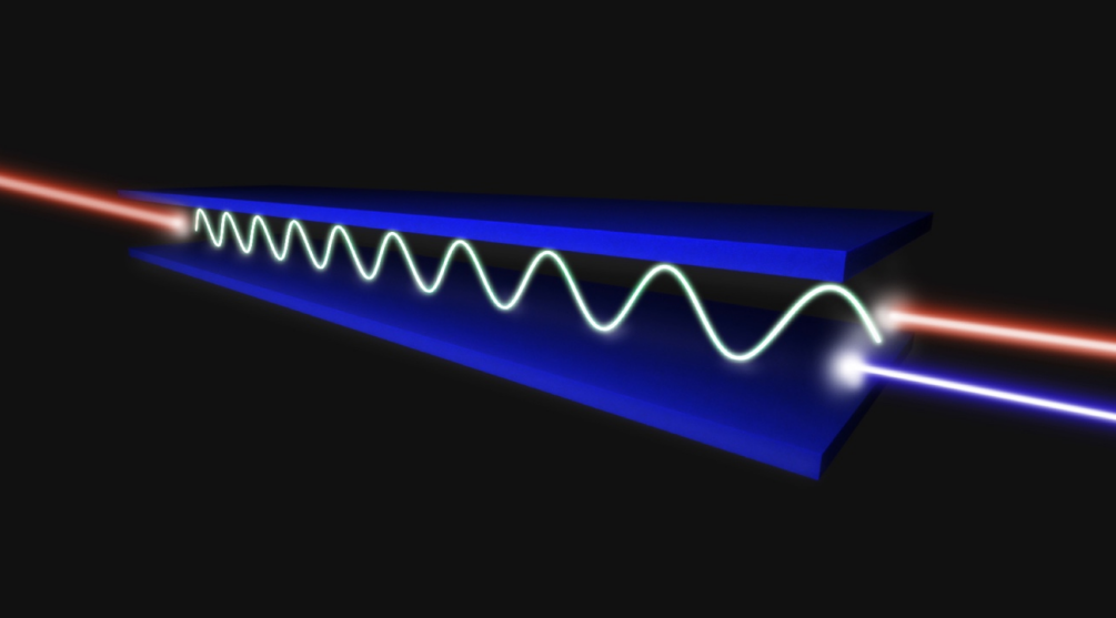 受激布里渊散射作为“光-机械”作用的一种形式,在针对它的研究中,人们一般关注光与 GHz 声波之间的交互。受激布里渊散射的基本原理为:在声波的辅助下,一个频率下的光被散射到约 10GHz 以外的另一个频率下。