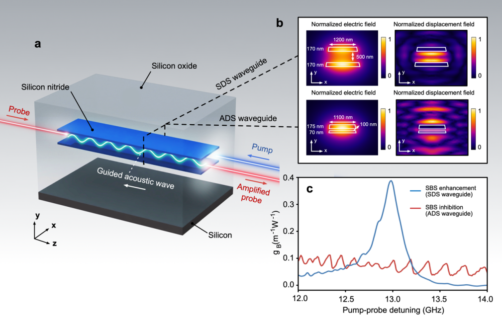 图 | a. 本文所采用的双层氮化硅波导结构渲染图;b. 该波导结构在不同层间距下的光场分布以及在光力作用下的位移场分布;c. 双层波导(SDS,symmetric double stripe)以及非对称双层波导的受激布里渊响应