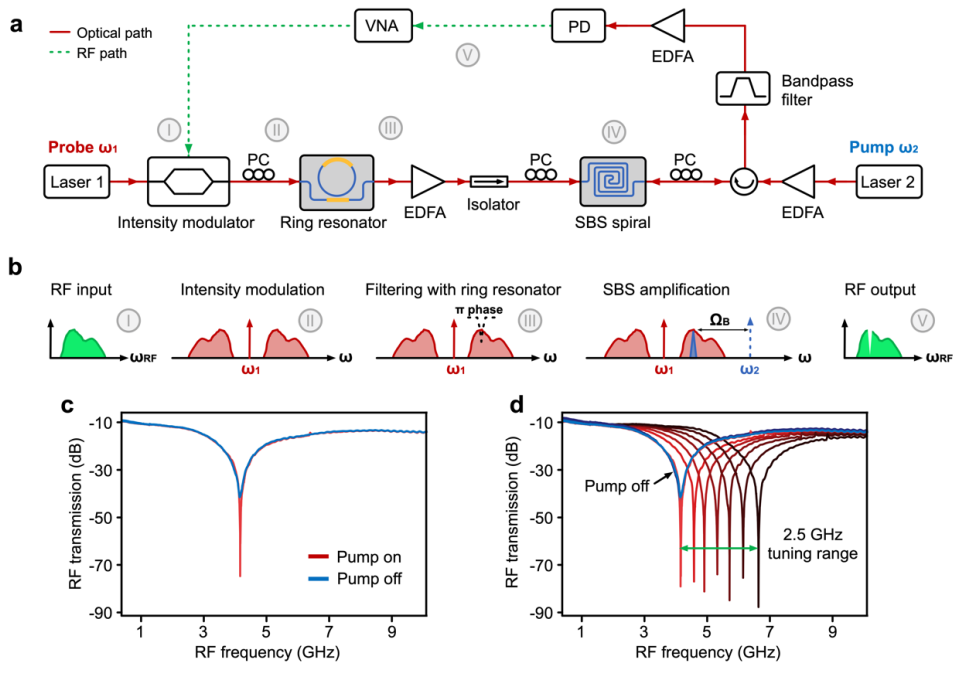 图 | 利用本文所采用的双层氮化硅波导构造的受激布里渊微波光子滤波器。a. 测量该受激布里渊微波光子滤波器的实验架构;b. 该受激布里渊微波光子滤波器的工作原理;c. 该受激布里渊微波光子滤波器在单一频率下的工作性能;d. 该受激布里渊微波光子滤波器在不同微波频率下的工作性能