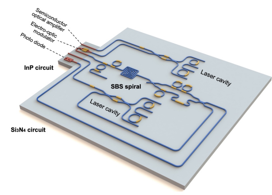 所以,他们计划设计如下一款芯片:同时集成微环、受激布里渊波导、以及激光谐振腔,并计划将该芯片和另一块集成半导体光放大器、光电二极管、以及电光调制器的磷化铟芯片封装在一起,真正实现一个全集成的微波光子信号处理系统。