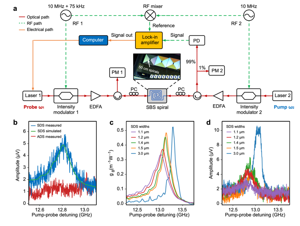 图 | a. 测量双层氮化硅波导受激布里渊散射的实验架构图;b. 对称双层波导(SDS,symmetric double stripe)以及非对称双层波导的受激布里渊响应测量结果;c. 不同宽度下对称双层波导的受激布里渊响应仿真结果;d. 不同宽度下对称双层波导的受激布里渊响应测量结果
