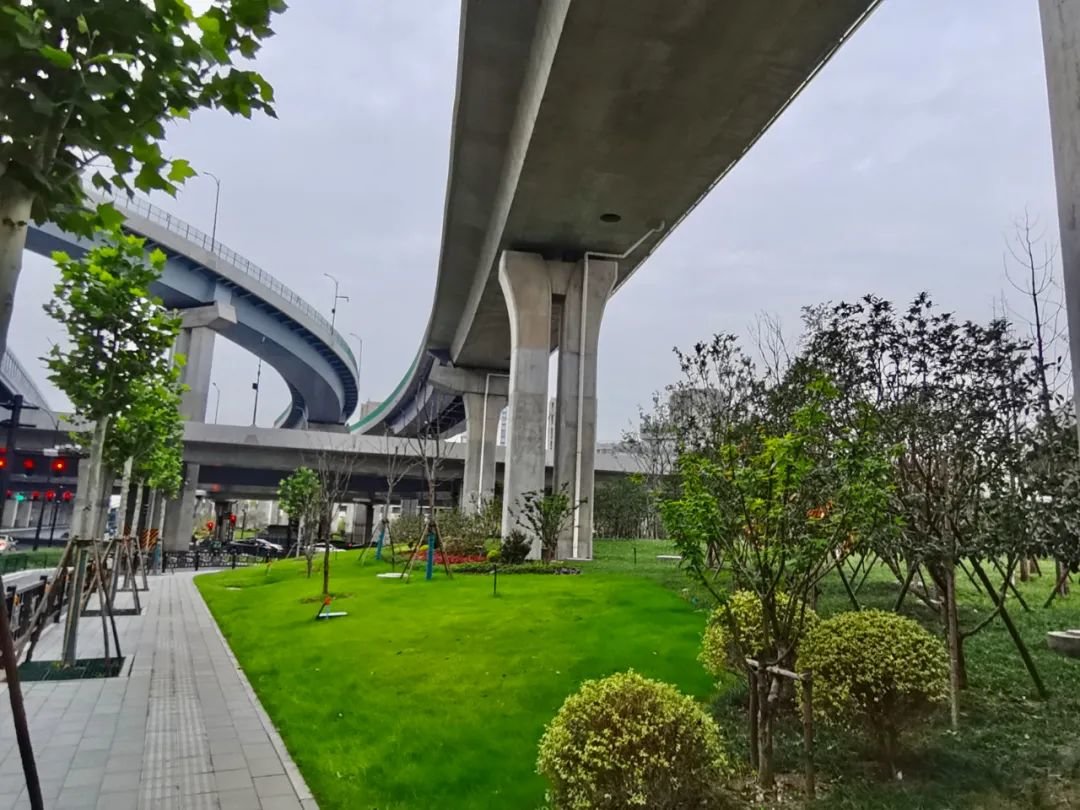 西兴互通:依托原有自然风貌,开展草皮覆绿修复、补植行道树、点缀乔木等工作,对交叉口区域结合时节氛围重点彩化,增强亚运氛围。