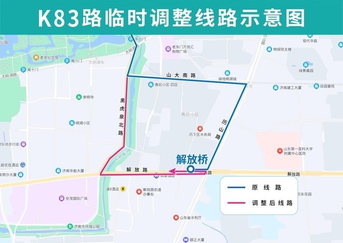 K83路临时调整后开往解放桥方向沿黑虎泉北路向南、解放路向东至历山路路口调头,临时撤销山大南路西口(路南)、山大南路历山路(路南)、解放桥北(路西)站点,临时增设青龙桥北(路西)、黑虎泉北路山大南路(路西)站点;开往匡山小区方向线路不变。