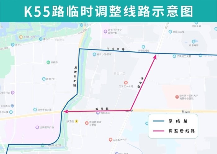 K55路临时调整后沿山大南路向西、历山路向南、解放路向西至黑虎泉北路向南恢复原线,临时撤销山大南路历山路、山大南路西口、青龙桥北站点,临时增设解放桥北站点。
