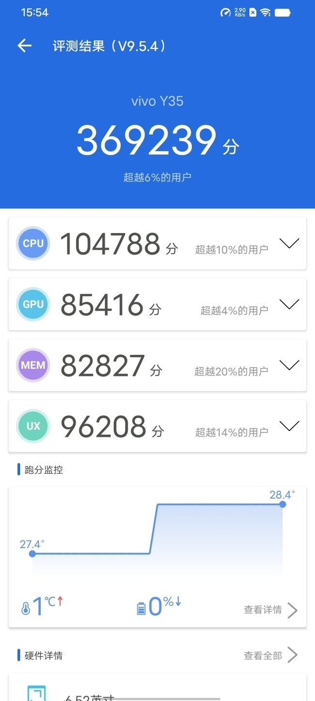 性能方面,vivo Y35采用天玑700移动平台,采用7nm制程工艺,由2个A76大核心+6个A55小核心组成,GPU是Mali-G57 MC2。支持 5G+5G,双卡双待及双模5G通信,功耗更低。经过实测,vivo Y35的最终跑分成绩为369239分。能满足日常微信聊天,刷抖音等应用需求。