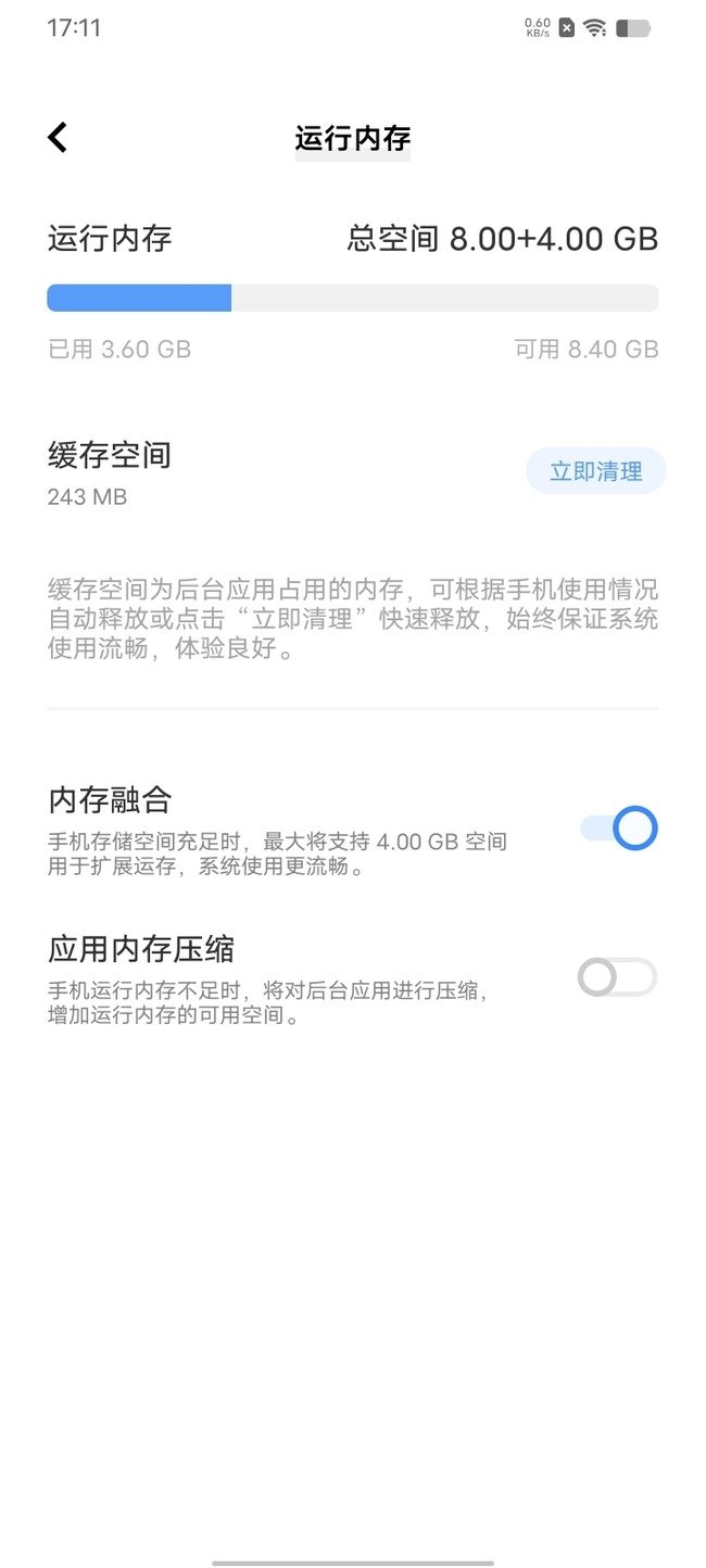 我手中的版本为8+128GB,vivo Y35支持内存融合2.0,能将RAM和ROM通过算法优化融合起来,调用部分闲置的ROM空间用于RAM运行,减少因为内存不足,进程后台被杀的概率,提高应用热启动率,大幅提升用户在后台多应用场景下的体验。8GB版本可以扩展成8GB+4GB。