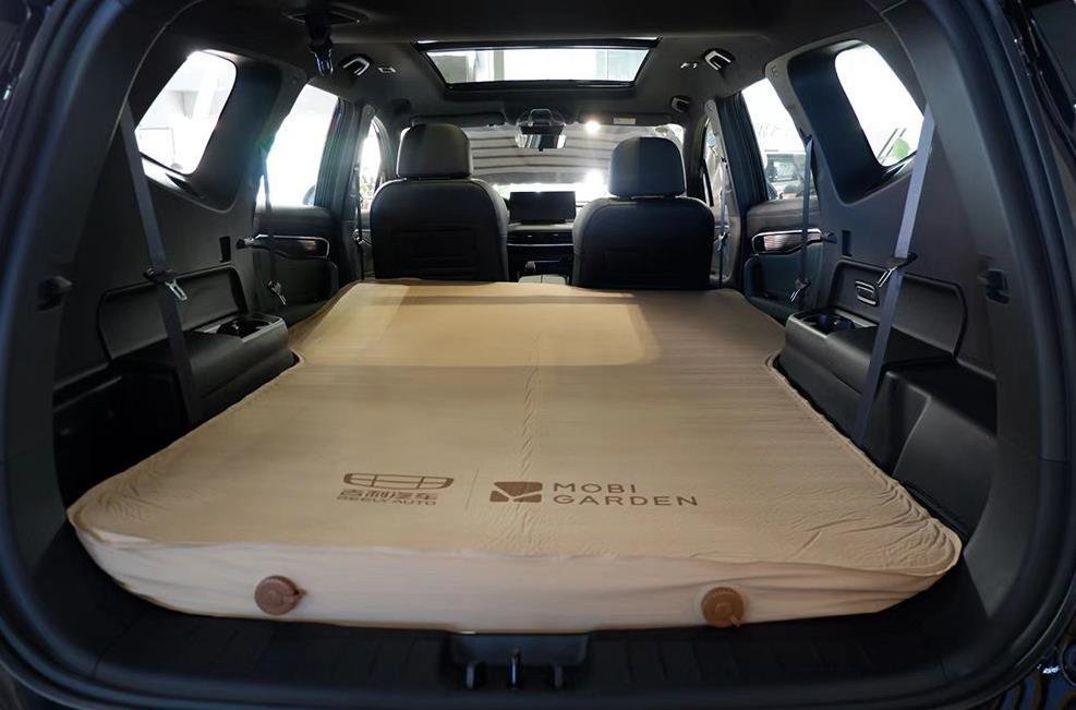当二三排全部放倒后,整个后部纯平,配合牧高笛定制的自动充气车载睡垫,后排变身2.2米大床,使用场景丰富。尊贵型配备了60英寸的全景天窗,车内乘坐感受通透,但多色氛围灯是顶配专属配置。