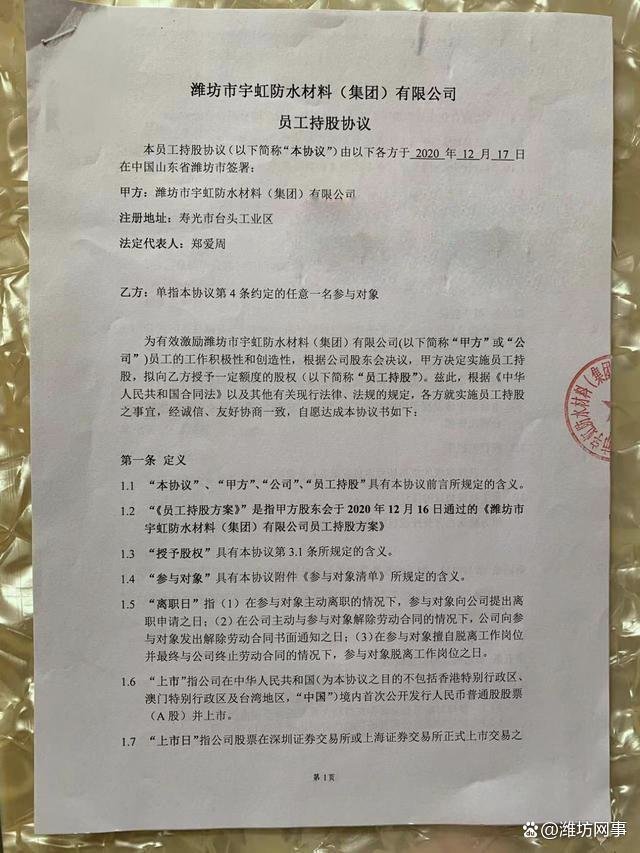据企业员工透露,潍坊市宇虹防水材料集团为“上市”,并召开了员工持股动员大会,下发了《潍坊市宇虹防水材料(集团)有限公司员工持股方案》(以下简称《持股方案》)。