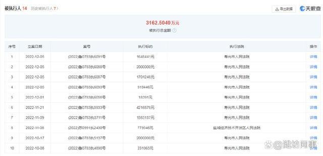 同时,潍坊市宇虹防水材料(集团)有限公司已多次被寿光市人民法院列为被执行人,被执行总金额3162万元。