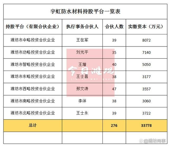 2020年12月份,潍坊市宇虹防水材料(集团)有限公司,分别在寿光市台头镇宇虹集团综合楼901室、902室、903室、905室、906室、908室、909室,成了7家合伙企业(有限合伙)吸收资金,资金额达337780000元,共有276人进行了投资。