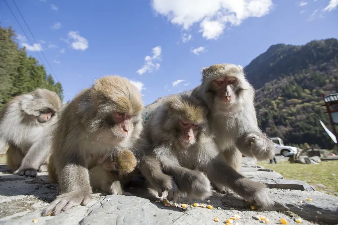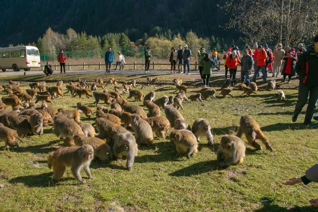 每年的这个时候,金猴海附近,藏酋猴们纷纷来到山下,活泼乖巧的它们,十分讨喜,成群结队地觅食、嬉戏,还可以跟你亲密接触喔。