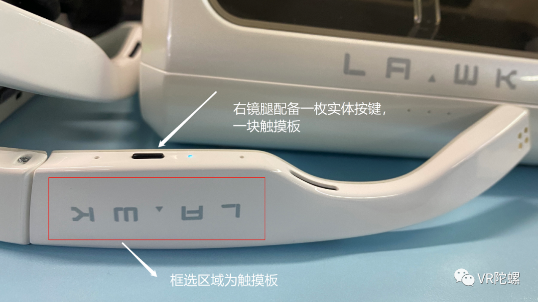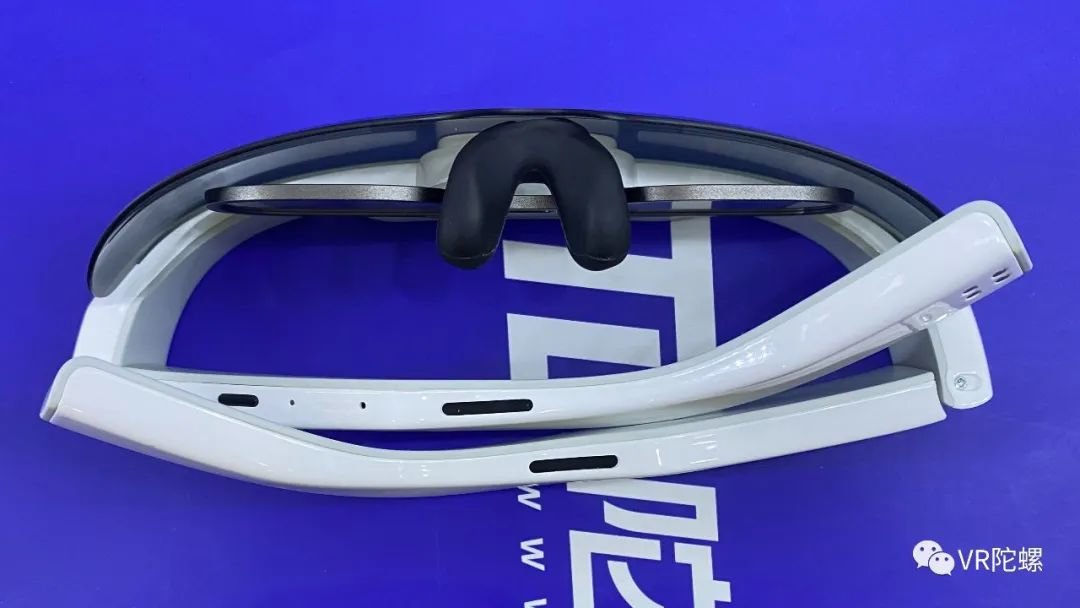 如果拿一些分体式AR眼镜产品做比较的话,可以发现它的“三围”要比其他产品大上一圈,实测眼镜本体(含镜片、鼻托部分)重量达到了94克。不过在实际佩戴时,并没有感觉到太多的重量焦虑,它的镜腿和镜框配重比较均衡,并且配备了无感鼻托,佩戴时不会出现头重脚轻的情况。