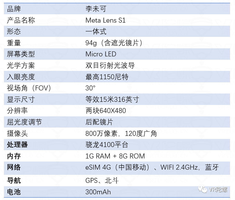 Meta Lens S1参数表,Meta Lens S1 Pro额外支持心率检测功能,图源:VR陀螺