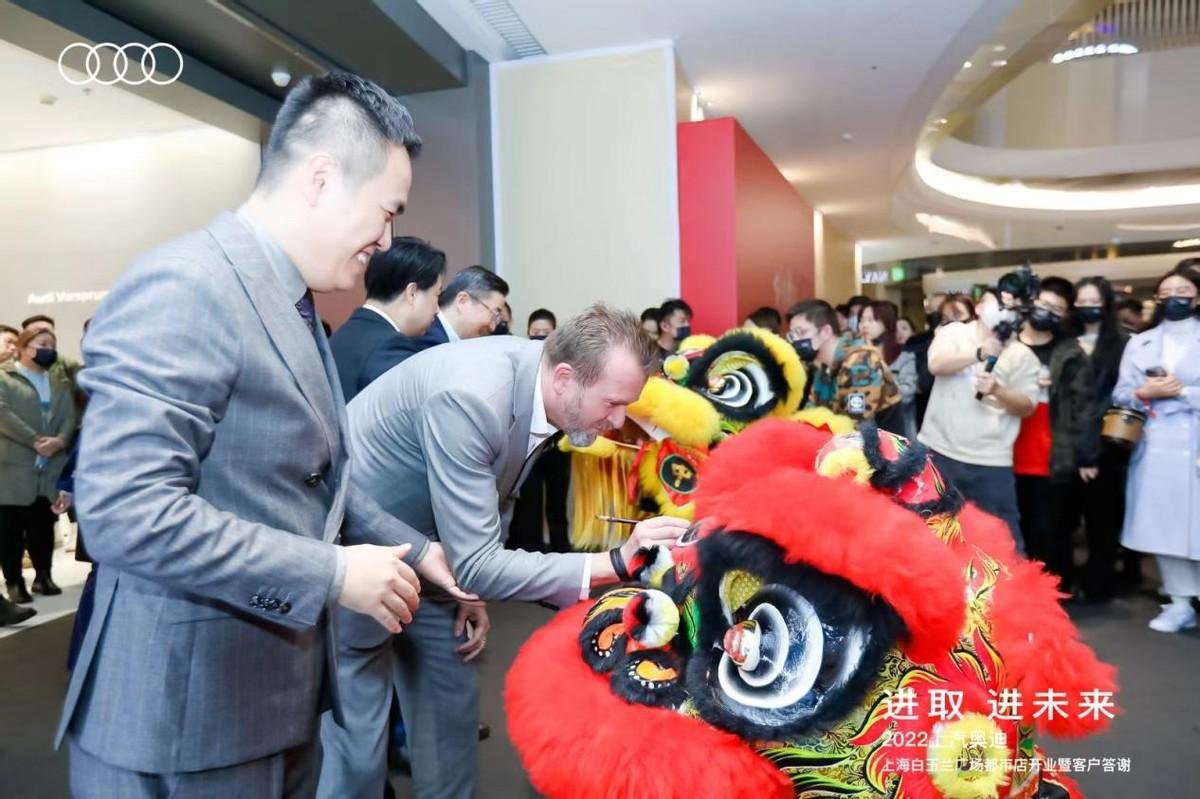 最后,在活动的高潮部分,两只生龙活虎的醒狮带着吉祥与如意的祝福,昂首阔步的登台入场。东联集团总裁陈怀志先生,上汽奥迪营销事业总经理:贾鸣镝博士,上汽奥迪营销事业品牌总经理:Mr Godulla,白玉兰店总经理钱晨先生一起为醒狮点睛,送上祝福!