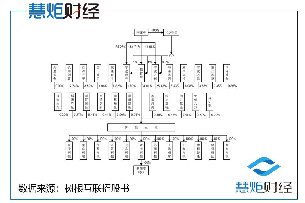本次发行前,梁在中通过宁波根智慧投资合伙企业(有限合伙)等公司合计控制58.54%股份及其对应的表决权,为树根互联的实际控制人。其父梁稳根通过三一重工、华胥基金持有公司4.94%、0.86%股权,其中三一重工为第5大股东。