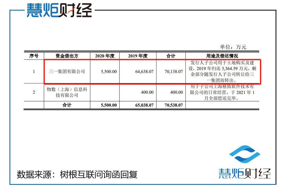 回复函显示,树根互联曾向三一集团有限公司拆借 70,138.07 万元,主要是树根互联原子公司广州置本用于土地购买及建设。