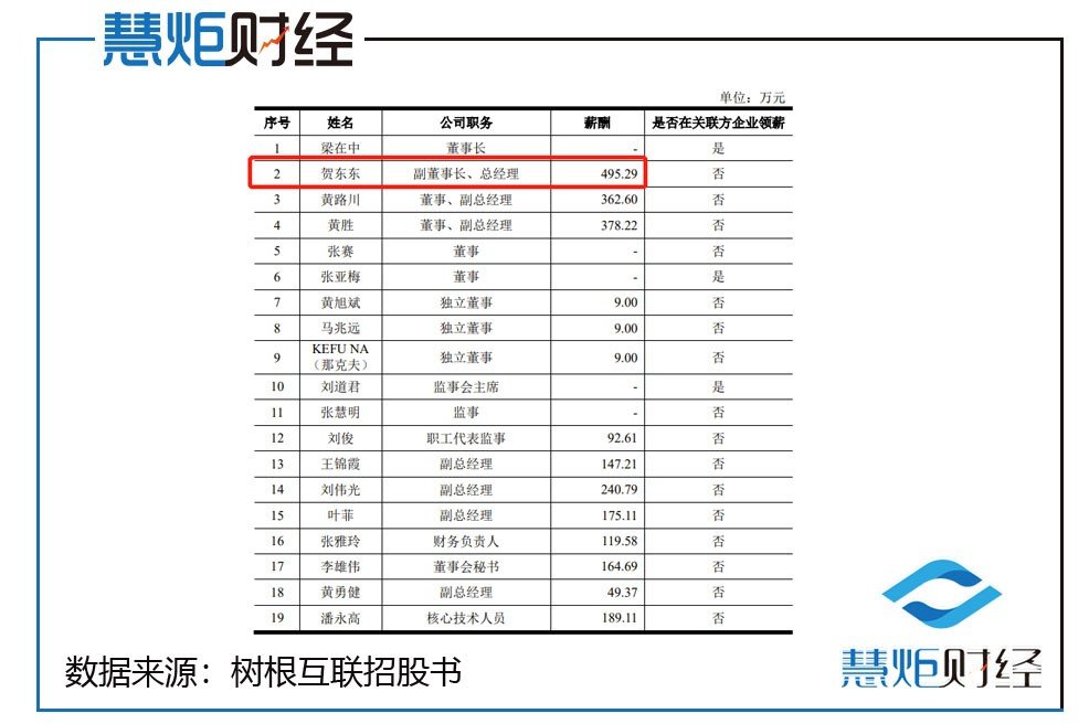 招股书显示,贺东东任职公司副董事长、总经理,主持公司日常经营工作,并主要分管国际市场、采购、政府事务及品牌等工作。2021年年薪高达495.29万元,其通过宁波万树间接持有树根互联 6.60%股份、通过宁波迈思间接持有树根互联 3.33%的股份。