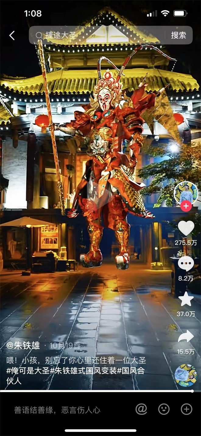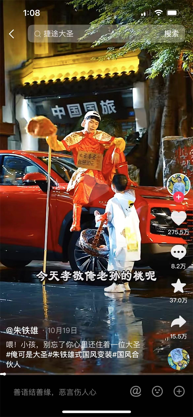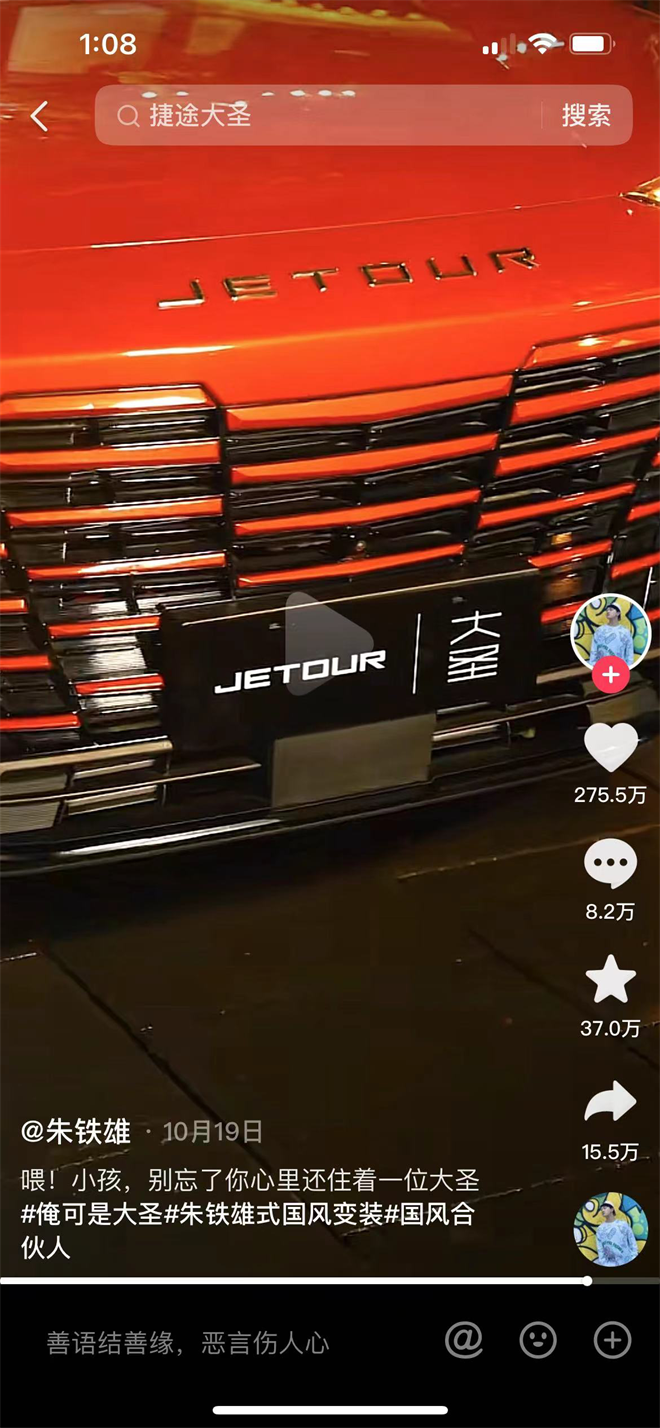 本年度深化“捷途速度”的营销抓手,当属10月联手“国风变装第一人”朱铁雄打造的短视频《大圣,你的心是石头做的吗?》。以捷途大圣“超级英雄”的国潮文化IP为背书,结合剧情反转等软植入,刻画大圣“追梦、无畏、强大”的中国传统文化底蕴和精神基因,深度触达Z世代人群,仅抖音平台点赞量达275万+……通过短视频内容的长效扩散力,驱动用户与品牌建立情感链接,激发人们了解捷途品牌、购买捷途车的热情。