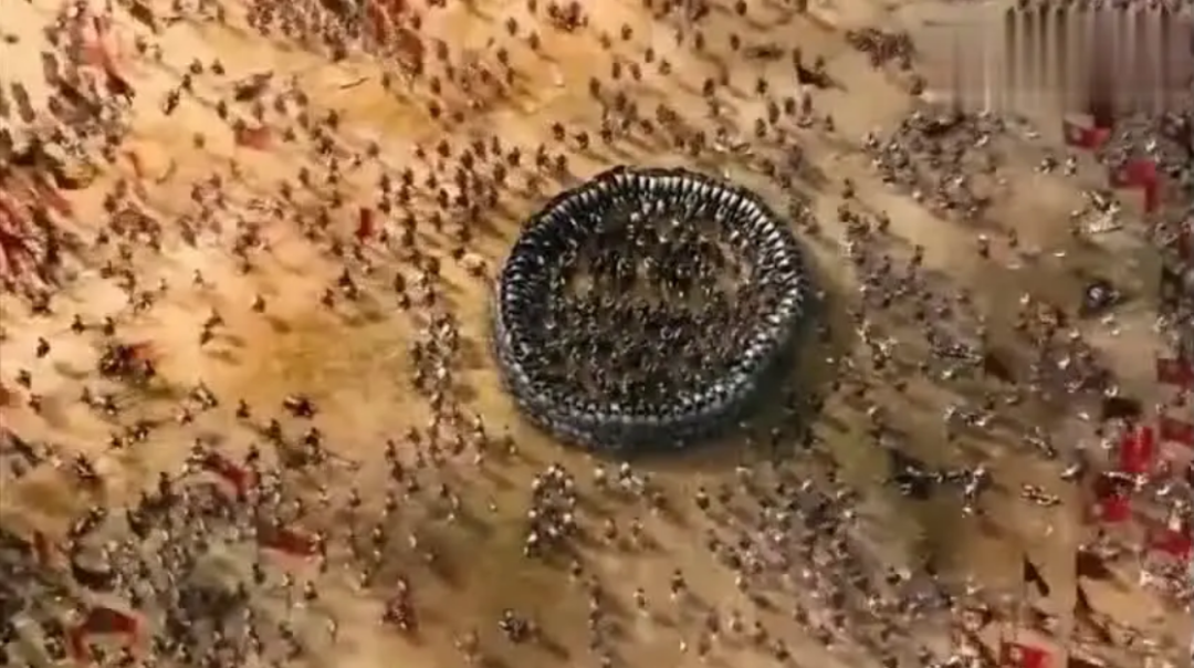 古希腊比格拉斯学派认为圆是一切平面图形中最完美的圆形,因为通过圆心竖一根对称轴,按此轴旋转至任何角度,都能与原图重合。于是问题来了,在敌军将至,地势起伏不平的战场上,一位一辈子可能只看过一两本兵书的将领,如何指挥自己手下上万名目不识丁的大头兵们,去摆一个让比格拉斯都赞叹不已的圆?