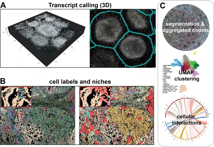 从亚细胞分辨率空间组学数据中捕获的信息主要被转化为单细胞格式(计数/细胞的量化)或csv文件,方便用于下游分析。研究团队介绍了用于一般空间分析的方法和已发布的软件包,以及用于高度多路复用图像可视化的现有多路复用图像查看器。