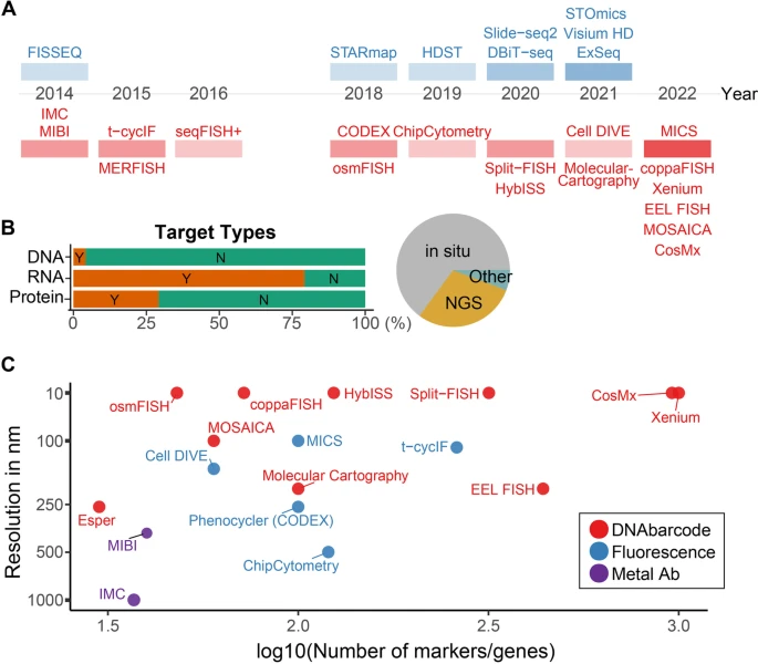 综上所述,空间组学领域在过去几年蓬勃发展,并从根本上提高了原位实验的广度和分辨率。这些技术现在可以在50-100nm的空间分辨率下检测超过10,000个独特的基因靶点。探针化学、图像采集和商业化的发展推动了其成本的降低,正将空间组学技术转变为所有实验室都能使用的普通技术,有望为传染病、肿瘤学和基础科学的新发现提供动力。