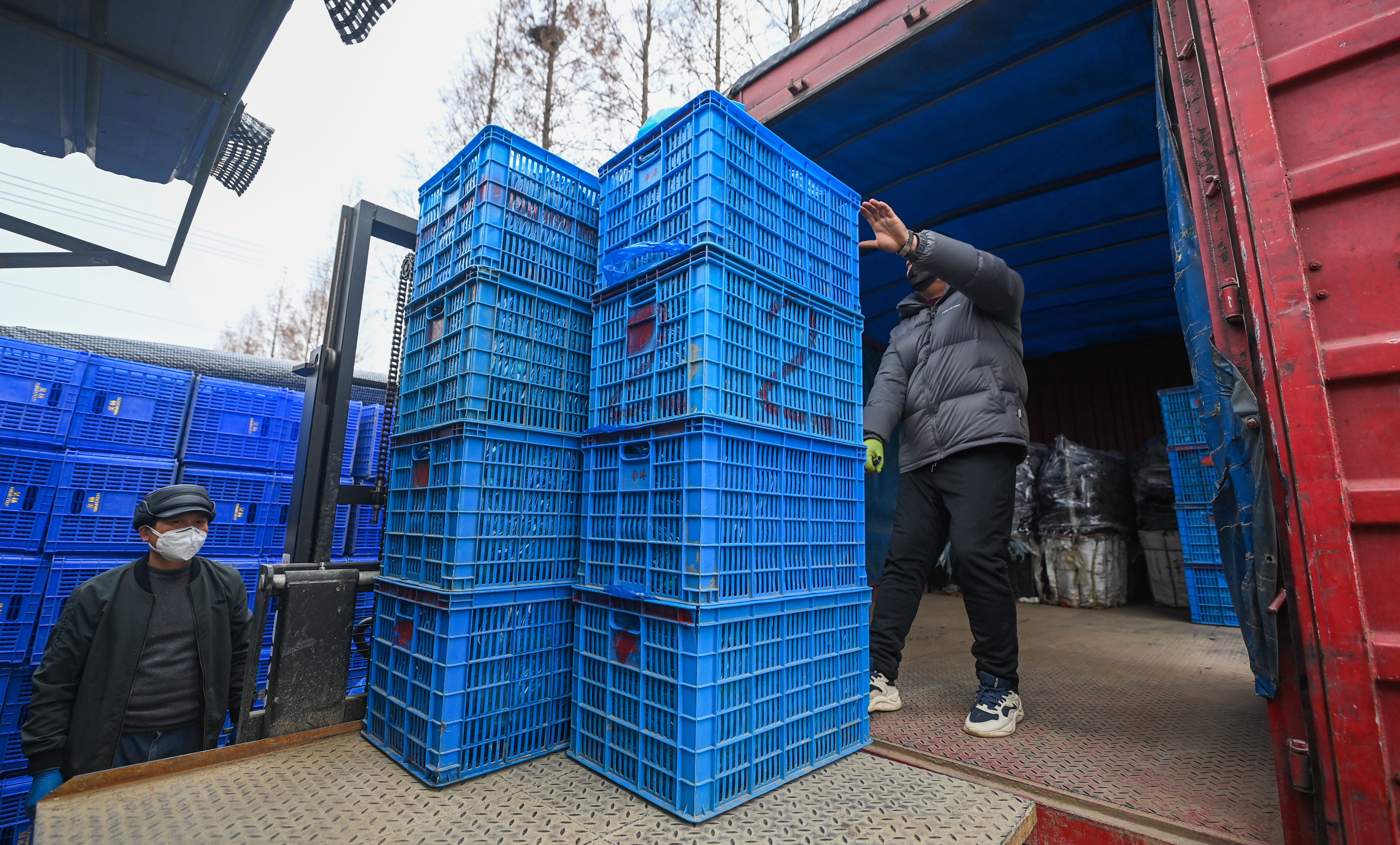 12月27日,在嘉兴市南湖区凤桥镇茜柳村,种植户把采收的蔬菜装车。新华社记者 徐昱 摄