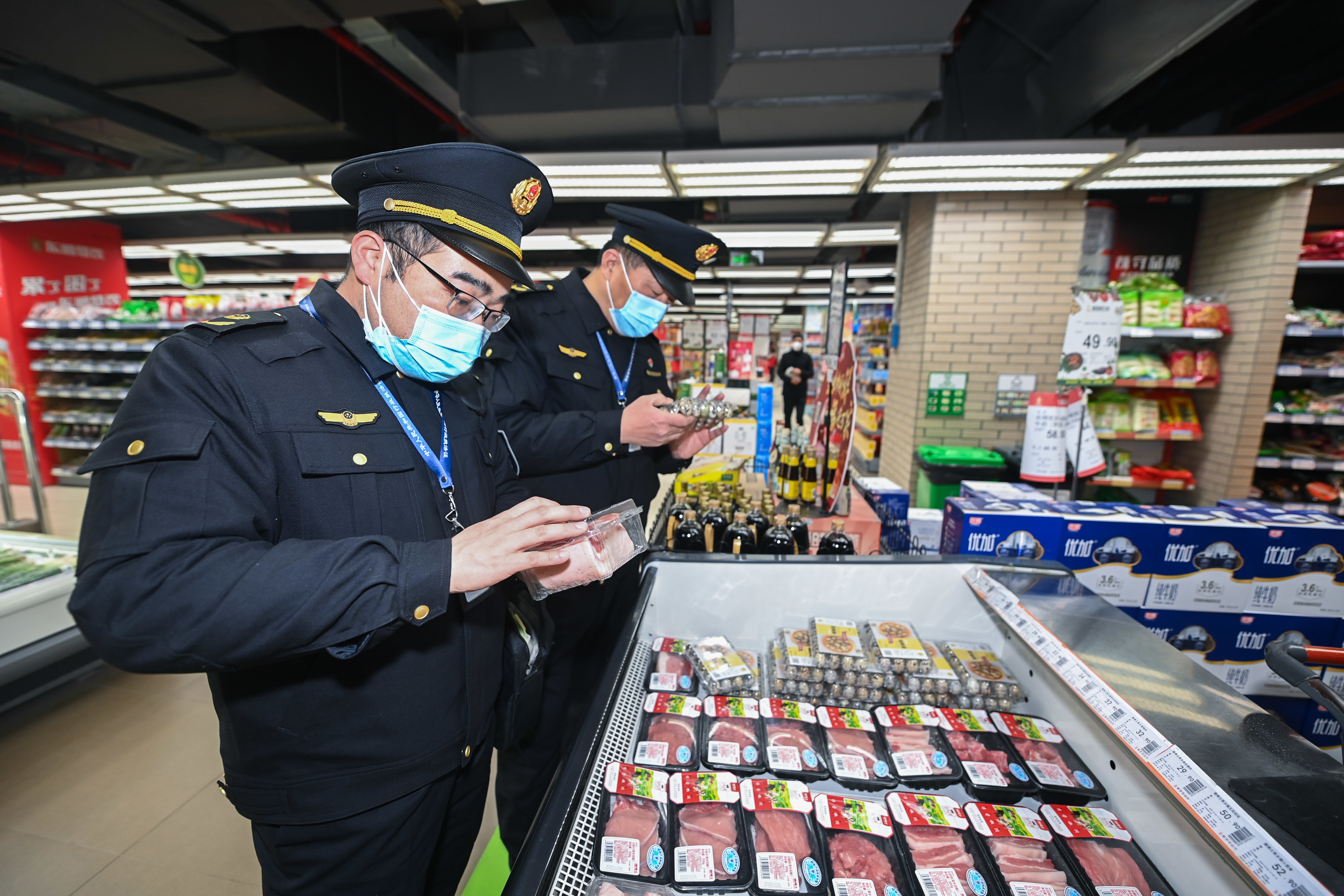 12月27日,在嘉兴市一生鲜超市内,嘉兴市南湖区市场监督管理局执法人员检查生鲜货品的来源和价格。新华社记者 徐昱 摄