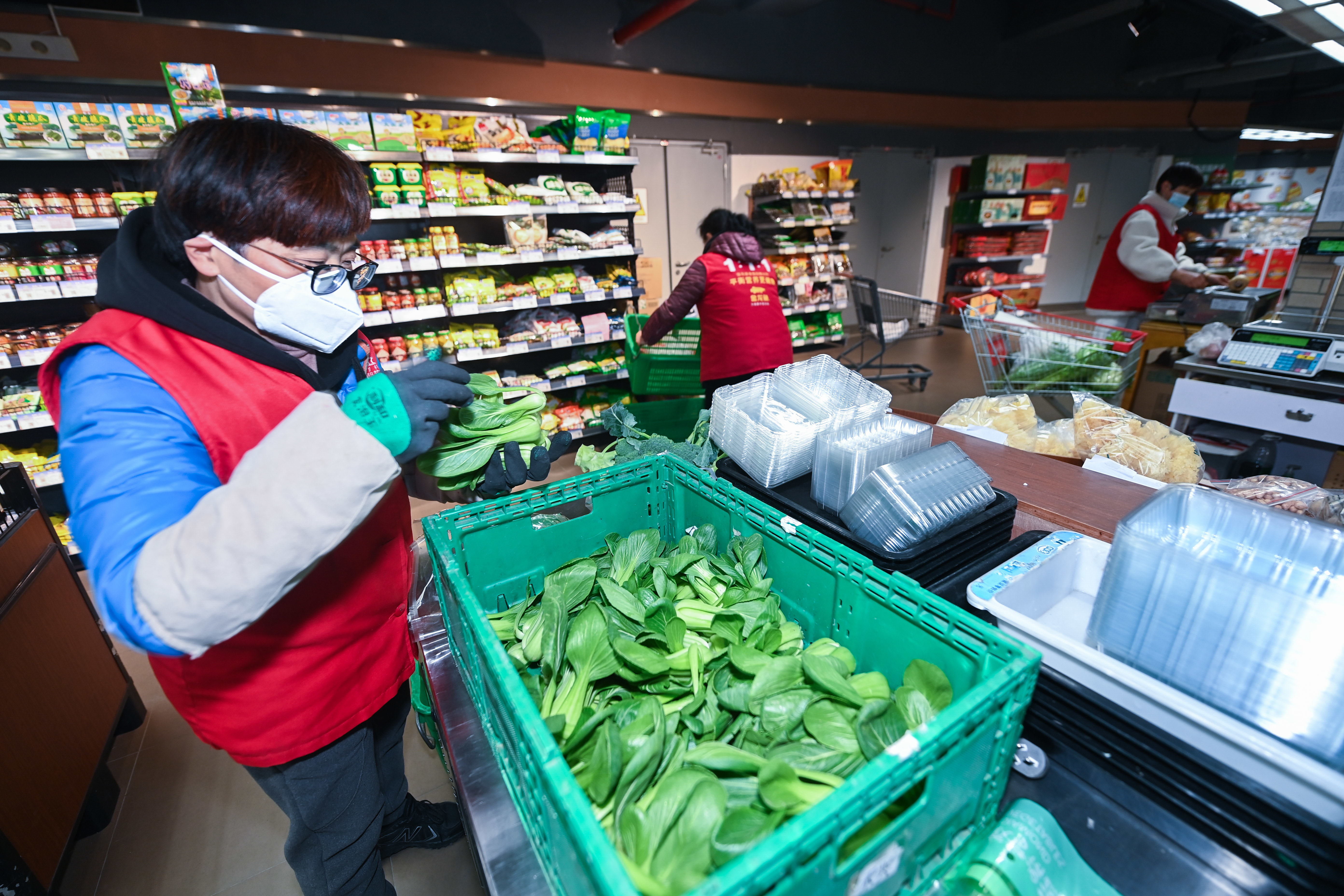 12月27日,在嘉兴市一生鲜超市内,工作人员在给新鲜蔬菜打包并称重标价。新华社记者 徐昱 摄