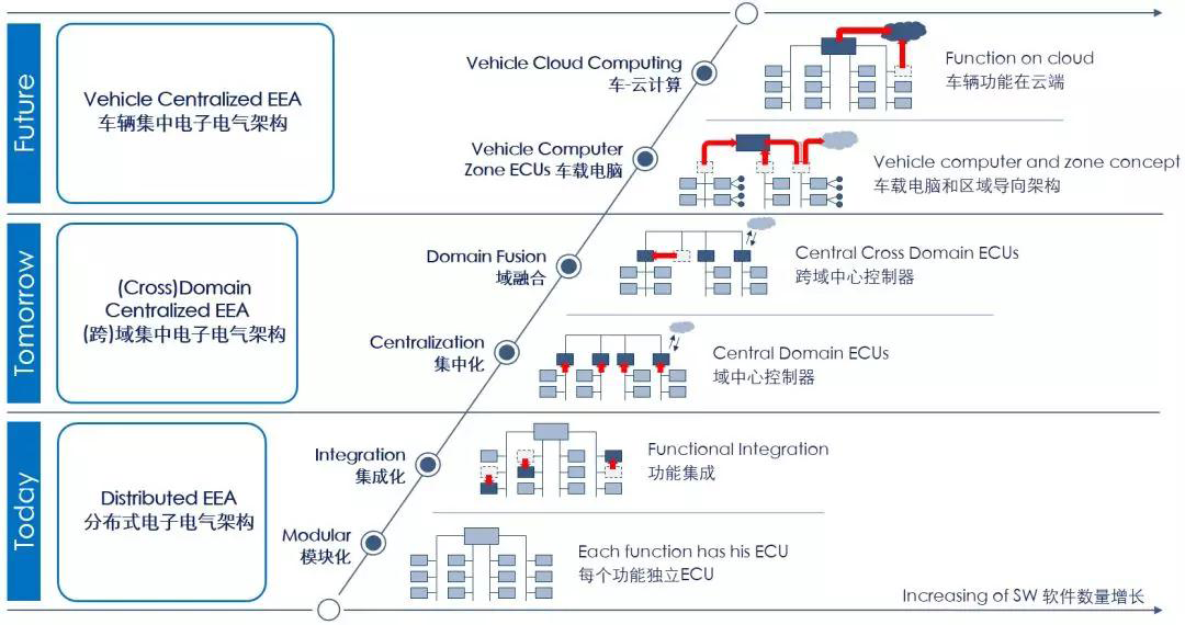 三、电子电气架构变迁,软件定义汽车趋势显著