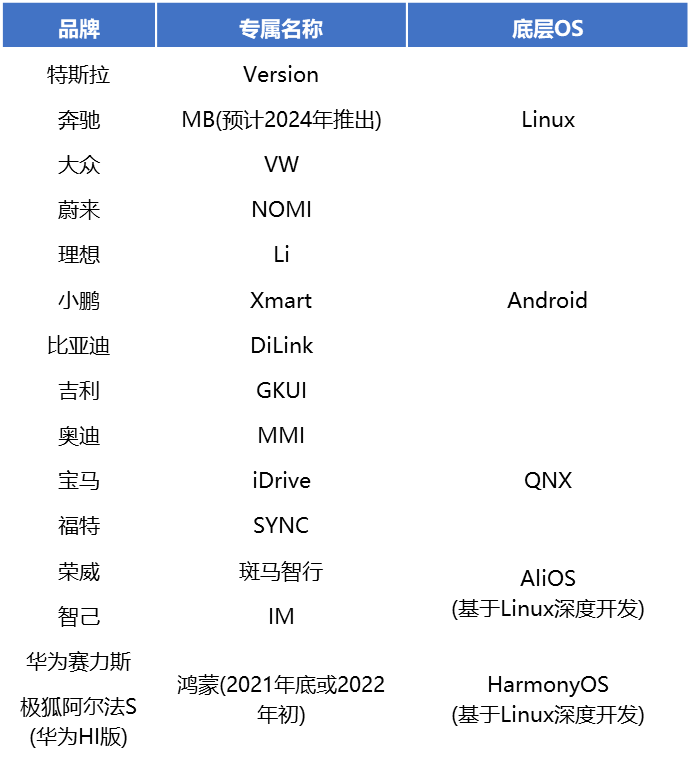 车载操作系统是唯一可驱动硬件工作的部分,内核主要有Linux家族(包括Android) 、RTOS家族(包括QNX\Vxworks)等。