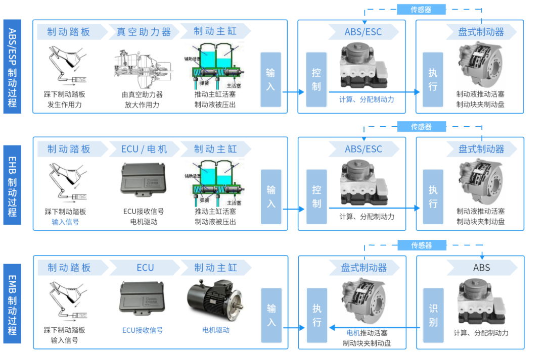 EMB抛弃了传统制动系统的制动液及液压管路等部件而通过电机驱动制动器产生制动力达到同样的效果,具备维保简单、响应时间短等优点,完全电子化能够与其他电控系统有效的整合,能够发挥更多的功能;目前市面上没有完全成熟的方案,Brembo、万都、瀚德、长城等国内外厂商在这个领域积极的探索,预计2023年能够实现量产。