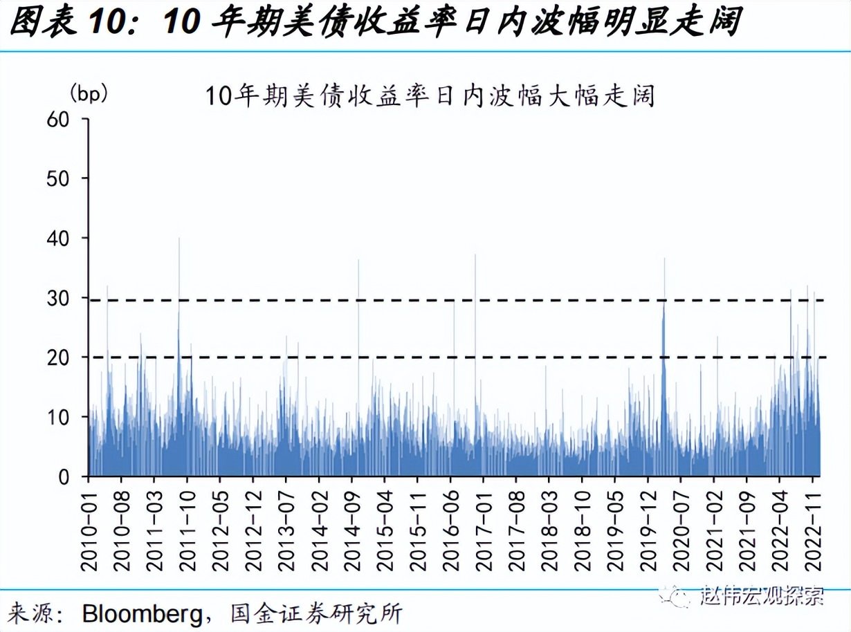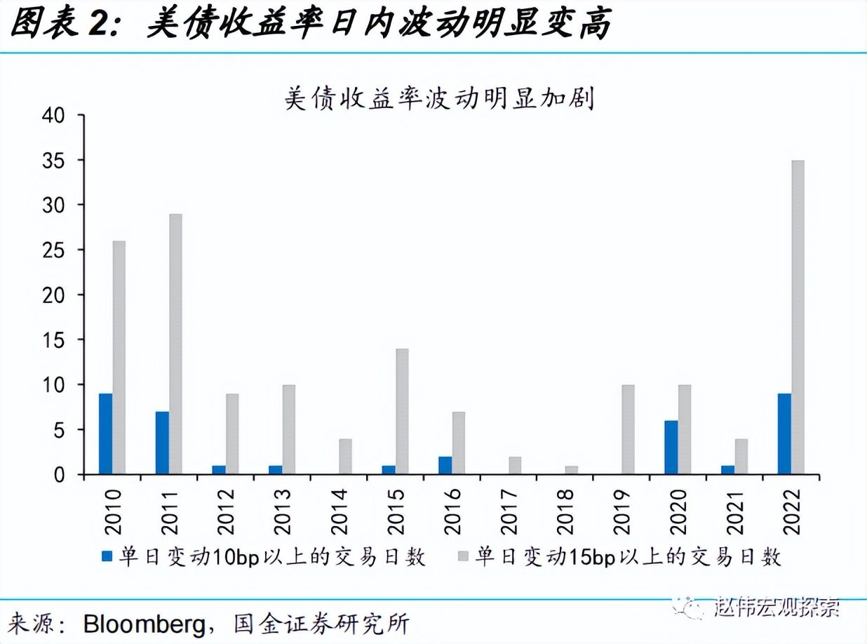 2022年以来,美国债券市场波动明显加剧。年初至今,美国10Y国债收益率一度由1.52%,在10月21日上破4.34%,随后又快速回落至12月9日的3.57%;2010年以来,10Y美债收益率单日波动较少超过10bp;而今年10Y美债收益率已经在35个交易日中出现10bp以上的变动幅度、在9个交易日中出现15bp以上变动,甚至在11月10日单日即出现30bp的振幅,市场稳定性明显变弱。