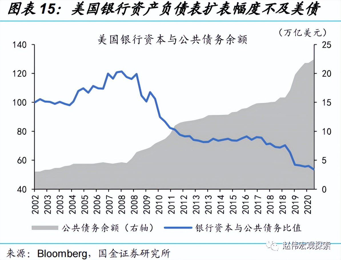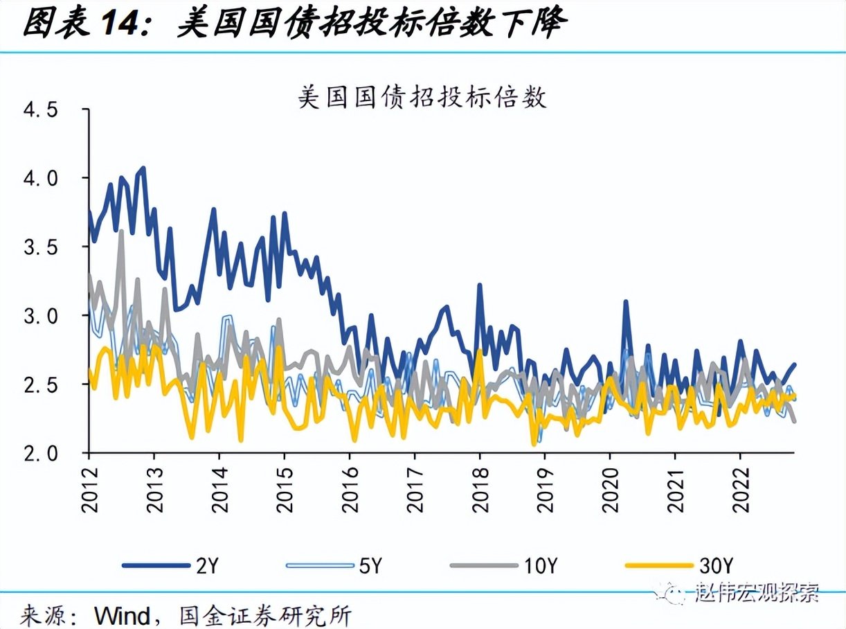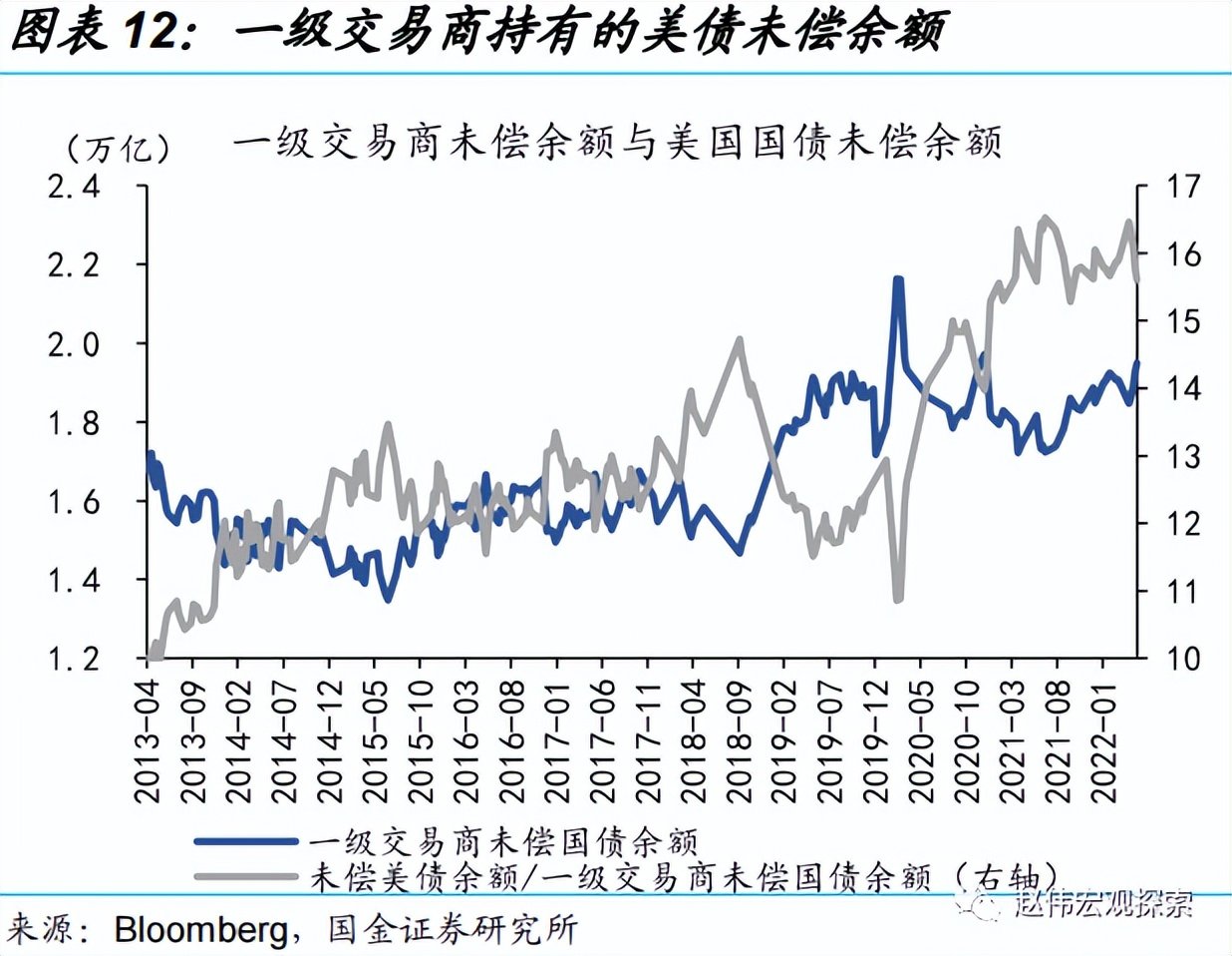 一级交易商承接能力的相对不足,则主要受金融危机后补充杠杆率的监管约束影响。金融危机后,美联储在2013年提出补充杠杆率的监管约束。该约束赋予低风险国债与高风险资产相同的风险权重,导致受SLR约束的银行类一级交易商、持有美债偏好明显弱化;从一级市场来看,SLR启用后,一级交易商美债招标倍数快速下降。监管约束下,金融机构扩表慢于美国政府,美国银行资本与公共债务余额比值由疫情前7倍回落至4倍左右。此外,今年以来加息、缩表带来频繁市场冲击,提高了做市难度,也导致一级交易商压降美债头寸。