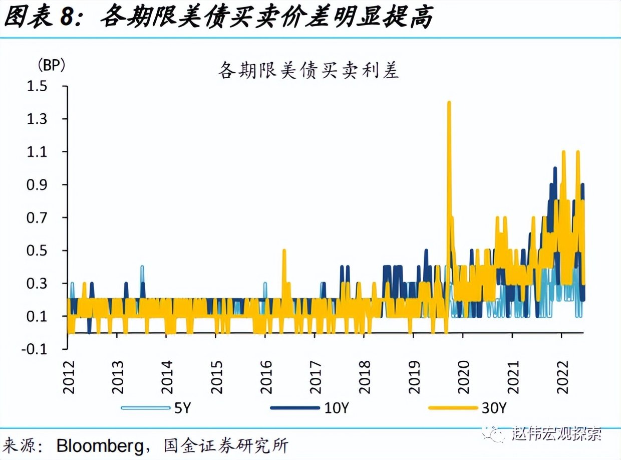 美债市场“深度”下降根源在于美债规模扩张,而一级交易商承接能力不足;前期宽松流动性环境掩盖了问题,而今年以来的紧缩转向则加速了问题的暴露。2008年金融危机以来,美国国债规模持续扩张;2020年疫情的爆发,则导致美债未偿余额进一步攀升,2019年末尚不到23万亿美元的未偿美债余额,当下已突破30万亿。而在本轮美债市场规模的快速扩张中,一级交易商持有的美债头寸始终维持在1.8万亿左右,提供的市场日均交易量也依旧在6000亿美元左右波动。美债存量规模的扩充,导致美债交易量占比被动下降。前期宽松的流动性环境掩盖了问题,而今年政策收紧以来,国债旧券流动性出现明显恶化。
