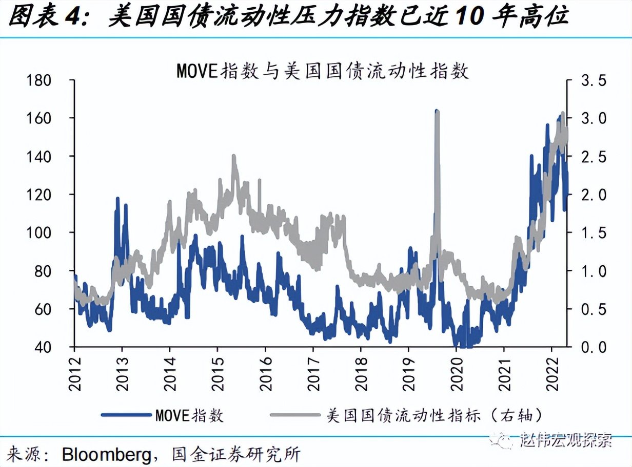 2022年以来,美国债券市场波动明显加剧;美债隐含波动率指数、流动性压力指数均攀升至10年高位。历史回溯来看,10Y美债利率单日波动超10bp不常见;而今年,已有35个交易日中出现了10bp以上波幅,美债市场稳定性明显变弱。截至12月25日,113的MOVE指数预示未来1个月内美债利率日均波动高达7.1bp;而美债流动性压力指数也处于近10年高位。