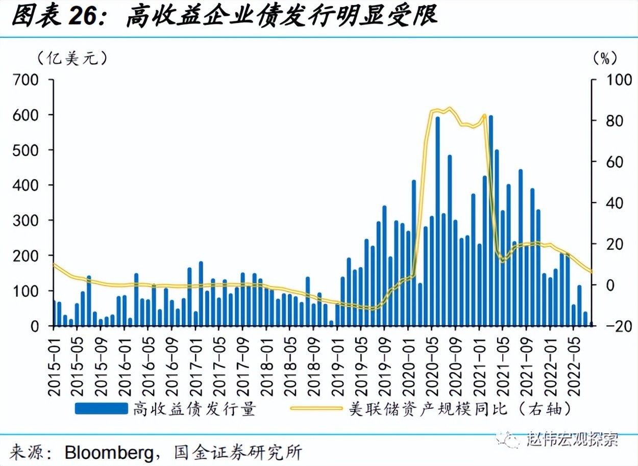 4、美联储缩表累积效应显现下,长期美债面临的流动性冲击或较过往更甚;美债市场波动溢出后,激增的高收益债违约风险也值得关注。1)当下,随着美联储缩表的推进,未偿美债的中长期占比不断抬升,中长期美债流动性的恶化程度或较过往更为严重;2)滚续能力受限的背景下,流动性恶化或进一步约束高收益债发行方融资,加剧美国高收益债市场崩盘风险。
