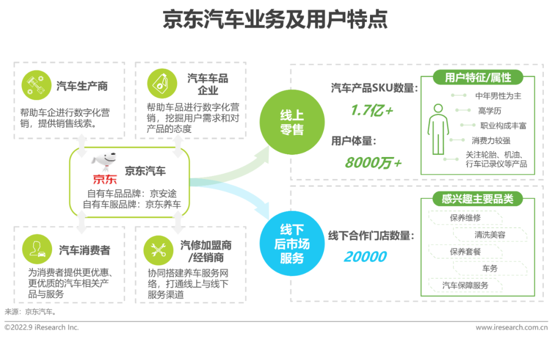 京东汽车业务范围涵盖整车、摩托车整车及二轮出行等业务、目前旗下有汽车用品/配件品牌京安途以及汽车服务品牌京东养车。线上零售业务方面,京东拥有超过8000万的汽车相关用户,以中年高学历男性为主、消费能力相对较强;线下服务业务则整合了2万家线下门店资源。京东汽车通过与各类汽车生产、车品、汽修等企业的合作,实现厂商、平台方、消费者的三方共赢。