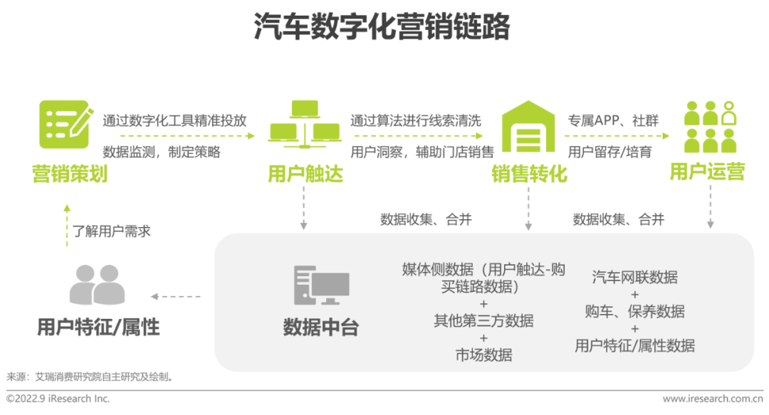 借助数字化工具将传统营销方式的各个阶段进行升级,利用数据反馈、监测等方式对营销活动进行调控,以达到更快更准确的用户触达,同时优化资源配置。内部用户数据、购车、用车和汽车网联数据与外部媒体侧、市场行业数据和其他第三方数据沉淀到车企的数据中台,更进一步了解真实、全面的用户需求,并将数据分析结果反哺在营销的各个阶段,帮助厂商实现触达-销售-留存全流程数据驱动。