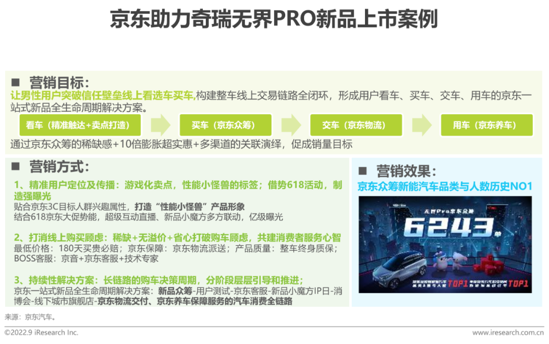 京东为奇瑞无界PRO上市拓展全新线上营销-购买一体化营销方案,构建整车线上交易链路全闭环。通过京东大数据用户洞察、高曝光流量池、京东独家众筹玩法、京东物流的配送能力与奇瑞iCar的个性化定制交付、京东京造与奇瑞iCar的周边产品共创、京东养车线下汽车养护能力的覆盖,形成用户看车、买车、交车、用车的京东一站式新品全生命周期解决方案。最终,借助京东众筹完成6243辆奇瑞无界PRO的众筹支持数,实现线上选车、购车链路的打通。