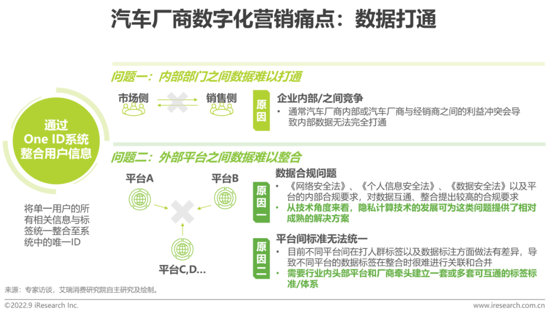 消费者的精细化洞察与运营是数字化营销的一项重要组成部分,其中的一项关键工作在于通过One ID系统整合单一用户的所有信息。尤其是对车企来说,由于用户信息相较于其他行业更加多样、结构复杂,成熟的One ID系统的价值将更加突显。目前,隐私计算技术的发展已让数据合规的One ID系统在技术上看见曙光,但是One ID系统的建设更像是建造一座“巴别塔”,关键在于要求车企以及不同相关平台间进行互通或整合。这将需要头部企业和平台之间通力协作,建立行业内可达成共识的标准,让各方以同样的“语言”共事。