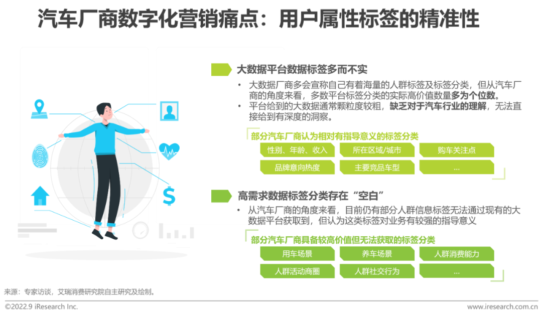 汽车厂商需要实现数智化洞察用户、线索管理和广告投放,通常以独立项目组负责、自建与外包相结合的方式推进转型进程,但仍在内部管理、大数据用户属性标签精准性、数据打通方面存在痛点。