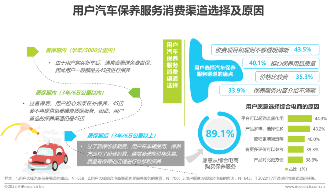 用户购买新车后,汽车的保养通常要经历三个大的阶段:在首保期内,通常是由4S店提供免费保养;而在首保期后,虽然4S店保养会收取费用,但是由于质保的限制,大多数用户仍然会选择4S店进行保养;在质保期过后,通常用户已经有了较多保养经验的积累,往往会选择更实惠的店铺进行保养。但在选择维修保养店时,收费不透明、对车品质量的担忧等时常困扰用户,而综合电商平台,不仅产品丰富、预约方便,且流程透明,有口碑可以参考,解决了用户选择保养渠道的核心痛点,近9成用户都表示愿意从综合电商渠道购买保养服务。
