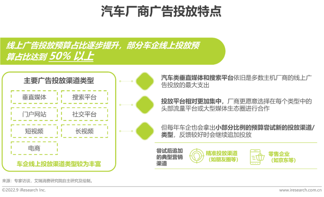 疫情迫使近两年企业在进行部分营销和活动时采用线上的方式进行,但这也使很多汽车企业更多地关注到了线上营销的优势,从而不断在线上广告投放上加大投入。与过去相比,汽车主机厂商在广告投放渠道的选择上更加集中,更会选择将主要预算花在头部流量平台上。但厂商也会利用小部分预算在各类新渠道进行实验性投放,并根据投放效果决定之后是否进行追加。