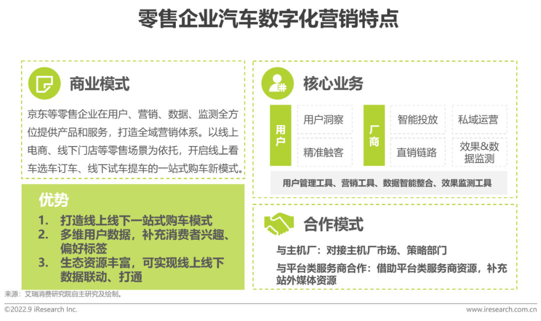 以京东零售为代表的零售企业,凭借自身的优质用户资源和技术能力优势为汽车厂商数字化营销各环节赋能,实现厂商的数智化全域营销策略升级。依托线上电商、线下门店等零售场景构建整车线上线下交易链路全闭环,形成用户看车、买车、交车、用车的一站式新品全生命周期解决方案。