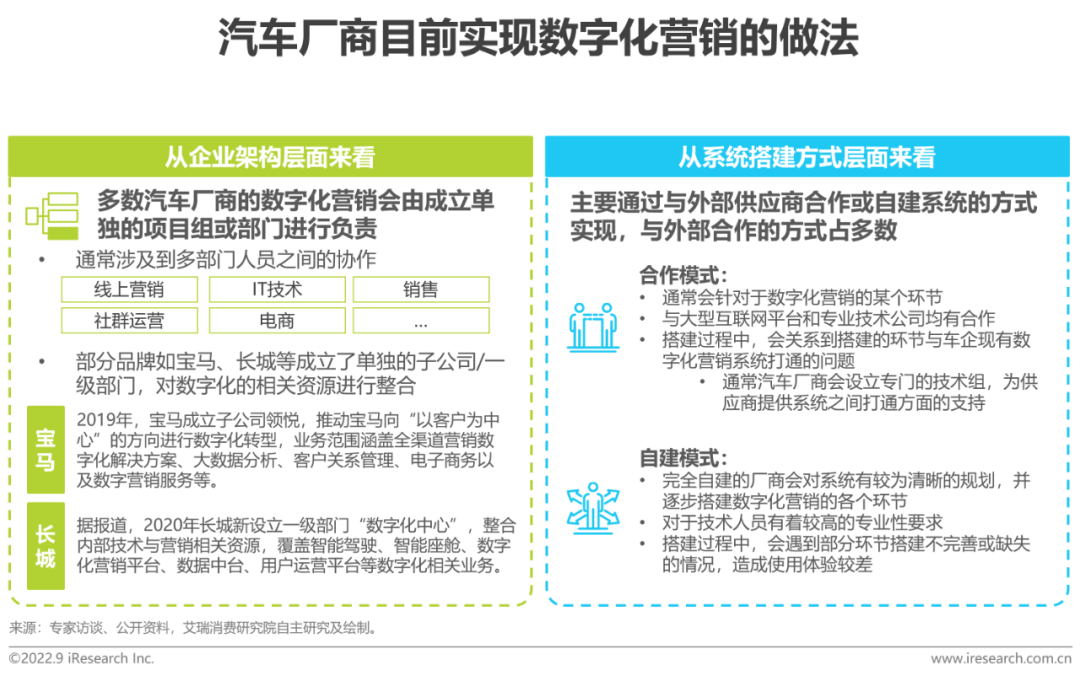 随着汽车厂商对于数字化营销的重视程度提升,多数厂商都会通过独立项目组或部门的方式,整合内部各部门资源,推进营销数字化转型。在数字化营销系统搭建方面,虽然有少部分厂商会选择完全自建系统,但自行搭建部分系统,另外的部分则通过对外招标的方式寻找供应商合作进行搭建的方式则仍为主流。