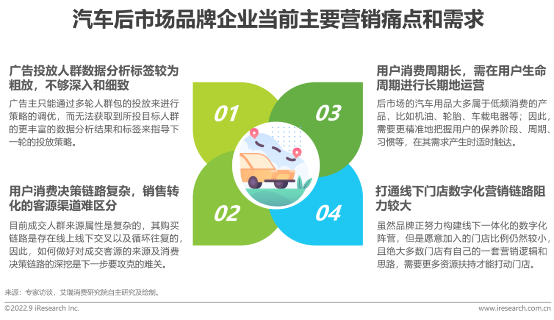 随着汽车消费市场从增量转入存量时代,汽车后市场的竞争也进入白热化阶段,因此,各大品牌企业对于平台或媒体的营销诉求也随之提升。目前,汽车后市场品牌企业当前主要存在四大痛点:一是投放人群包的数据回溯分析不够深入细致,无法对下一轮投放提供更多的指导性;二是用户消费决策链路交叉往复,成交用户的渠道来源难区分;三是用户消费周期长,需对用户进行长期运营,才能促进转化;四是线下门店数字化营销链路打通的阻力较大。