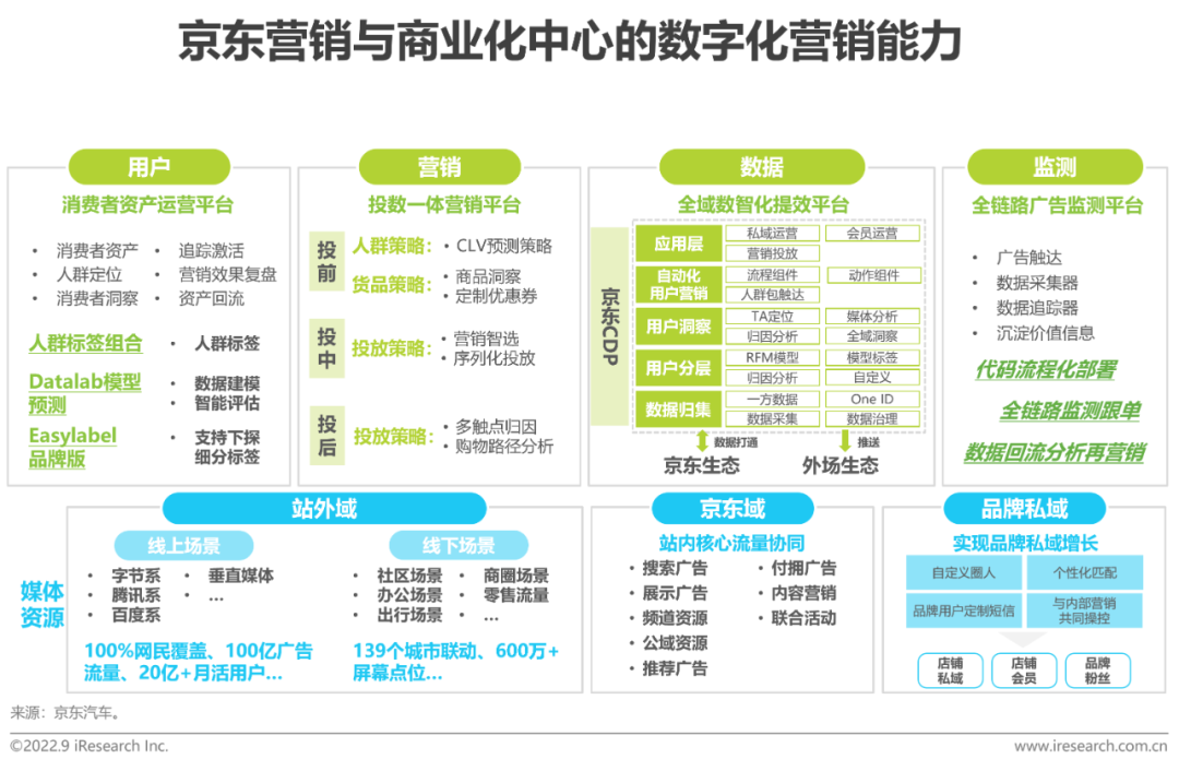一方面,京东可提供数字化营销全链路上的产品与数智化服务,赋能汽车厂商数字化营销的各个环节,实现厂商的数智化全域营销策略升级;另一方面,京东的媒体资源较为丰富,除京东外,对于线上各类主要流量平台与线下场景均有覆盖,并提供打造品牌私域的有效工具,沉淀私域流量。